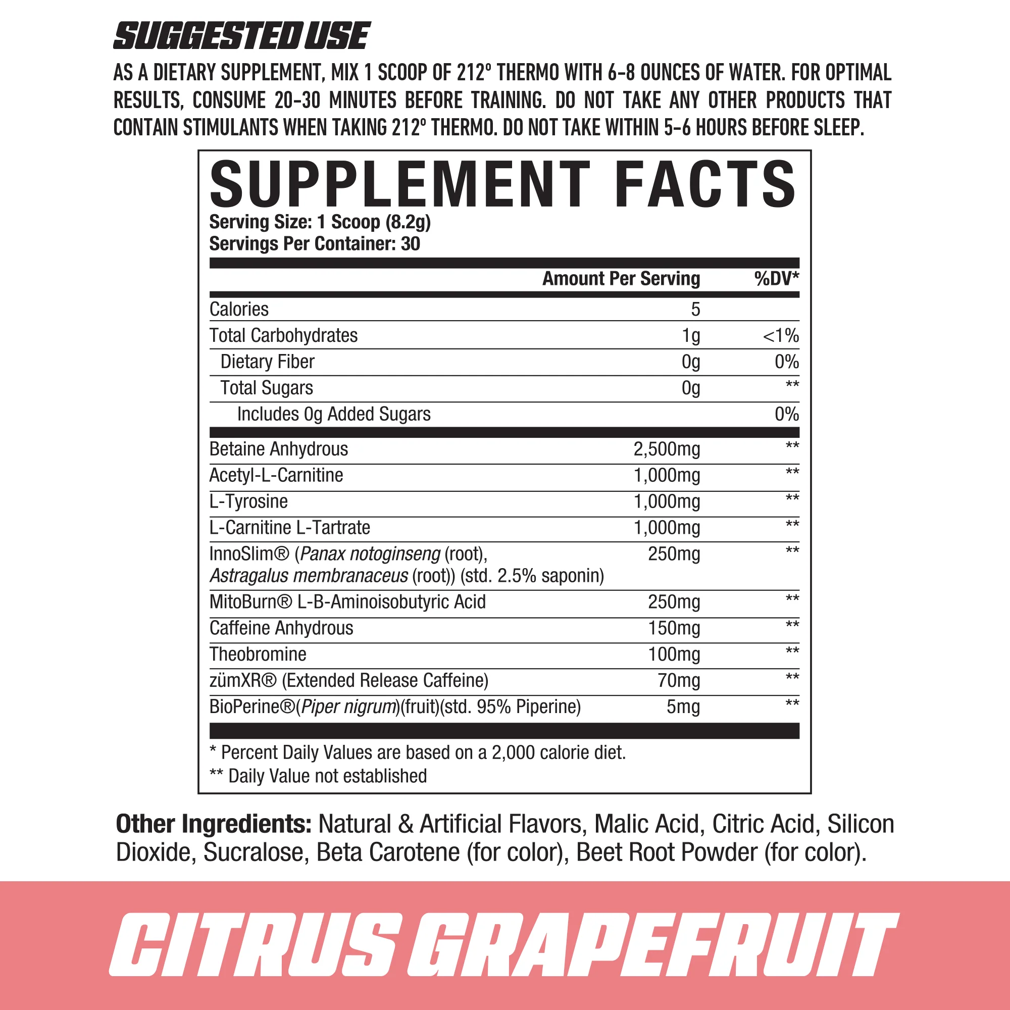 212 Thermal is a powdered thermogenic. It is packed with stimulants, GGB and two different forms of Carnitine. It contains the perfect amount of stimulants, and other thermogenic ingredients that can be used to heat up the body to increase thermogenesis.