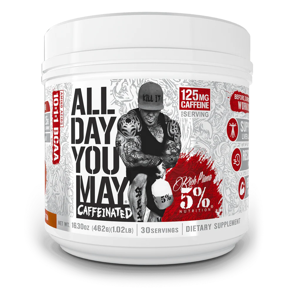 If you’re serious about gains, you want to start your day in an anabolic environment but you also want to get your morning energy kick. This usually means two separate drinks as well as maybe a little digestion time between the two and more hassle than you really want. Now, you can get it all in one drink with new ALL DAY YOU MAY Caffeinated by Rich Piana 5% Nutrition!