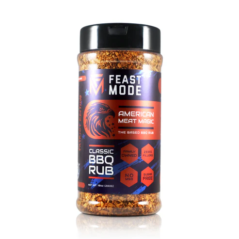 Feast Mode Flavors is proud to unleash the All-New Patriot Edition: ‘Merican Meat Magic. Comes in a freedom-sized 10 oz bottle, this heroic mix brings the firepower to your grill with bold BBQ flavor that’s guaranteed to make your taste buds salute. Perfectly balanced with savory spice, and a kiss of peppery sweetness, it’s the ultimate seasoning for meat lovers, meal preppers, and gym warriors who prefer their gains with a side of liberty.