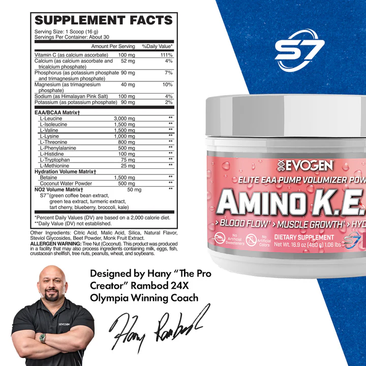 In order to open up a “super-highway” for amino acids to enter your hard-working muscles, vasodilation must be optimized. For this reason, Evogen CEO Hany “The Pro Creator” Rambod included a potent yet natural S7™ phytoblend which is clinically proven to increase NO2 levels by 230%