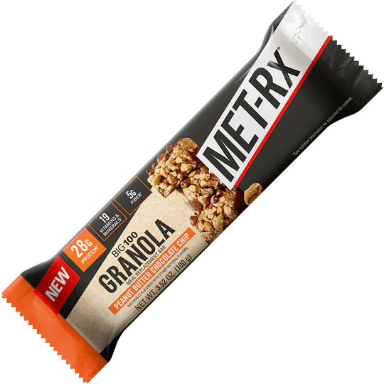 Start your active day with MET-Rx BIG 100 Peanut Butter Chocolate Chip Granola Bars, offering familiar granola flavors and textures combined with a powerful 28g of protein per bar.
