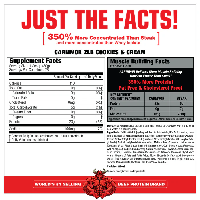 CARNIVOR Beef Protein Isolate delivers all the muscle-building power of beef with greater amino acid levels than other protein sources used in supplements, including whey, soy, milk, and egg. CARNIVOR Beef Protein Isolate (BPI) is even 350% more concentrated in anabolic muscle building aminos than a prime sirloin steak! Plus, it is sugar-free, fat-free, lactose-free, and cholesterol-free! Not to mention, CARNIVOR is one of the most delicious protein shakes you’ll ever try!