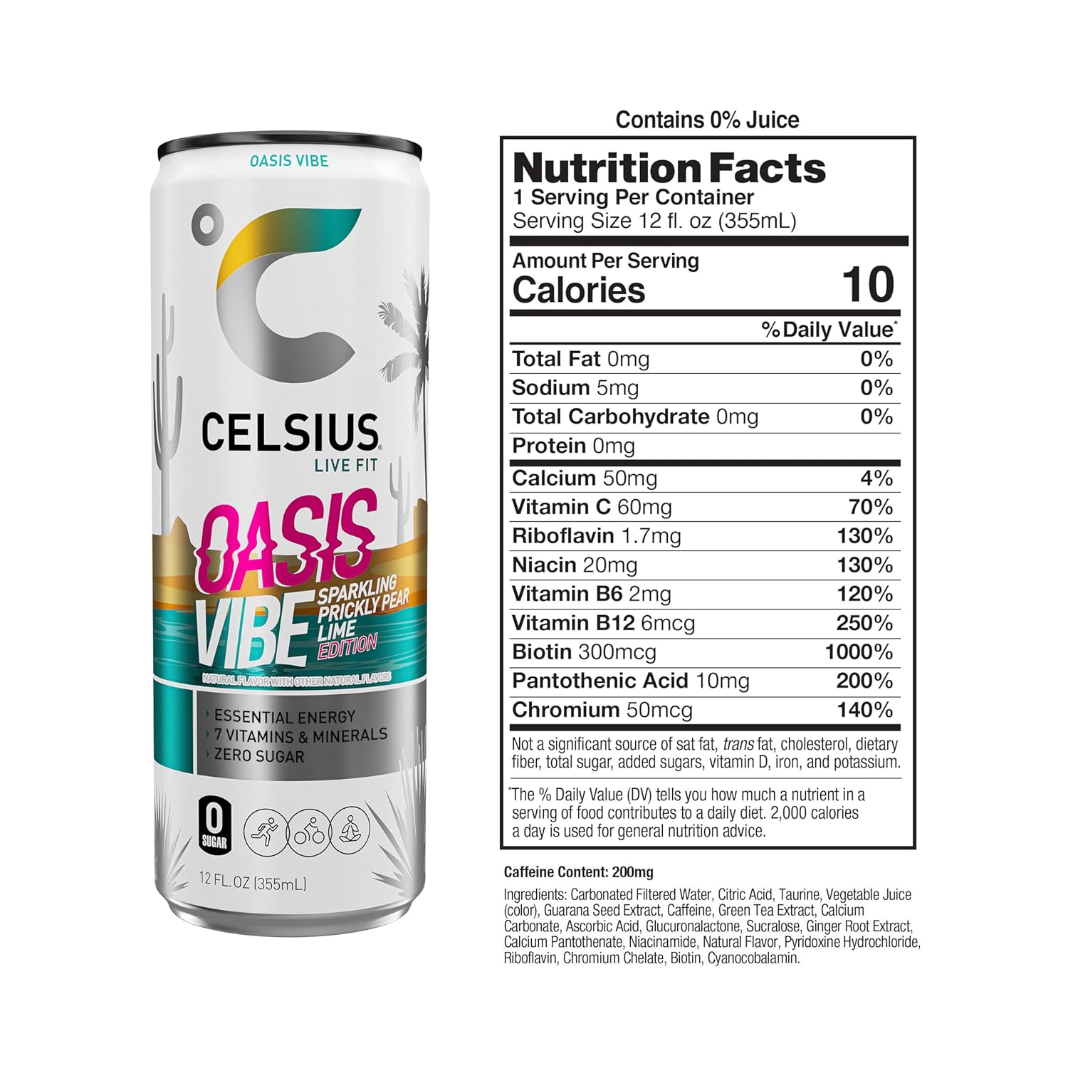 Functional, Essential Energy with 200mg Caffeine to help you LIVE FIT. Made with Premium, Proven Ingredients and 7 Essential Vitamins. No Sugar, No Sodium. No High Fructose Corn Syrup, No Aspartame, No Artificial Flavors or Colors. Gluten-Free, Kosher, Non-GMO, & Certified Vegan