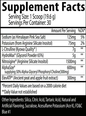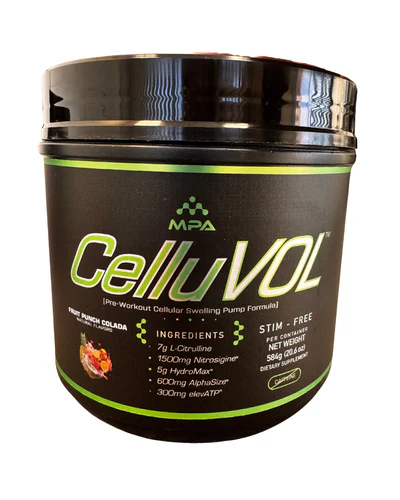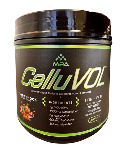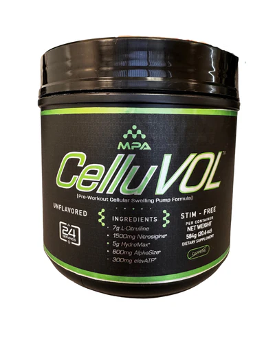 MPAs CelluVol non stim preworkout is a fantastic cell-vollumizing pump product. It has 7 grams Kyowa Quality Pure L-Citrulline which is converted to L-Arginine in the body to support L-Arginine and nitric oxide levels. 1500 mg Nitrosigine – boosts key factors for increasing blood flow during exercise 5 grams HydroMax – HydroMax Glycerol helps to prevent dehydration during exercise, improve exercise performance and increase muscular pumps during resistance training. 600mg AlphaSize (A-GPC) – AlphaSize A-GPC has interesting utility in “mind-to-muscle” sports nutrition formulations, where it acts to optimize muscular power output, sharpen agility, and also delay mental fatigue. This is due to its action involving motor unit activation of muscle fibers and subsequent muscle contraction, as well as due to its mental sharpness benefits.