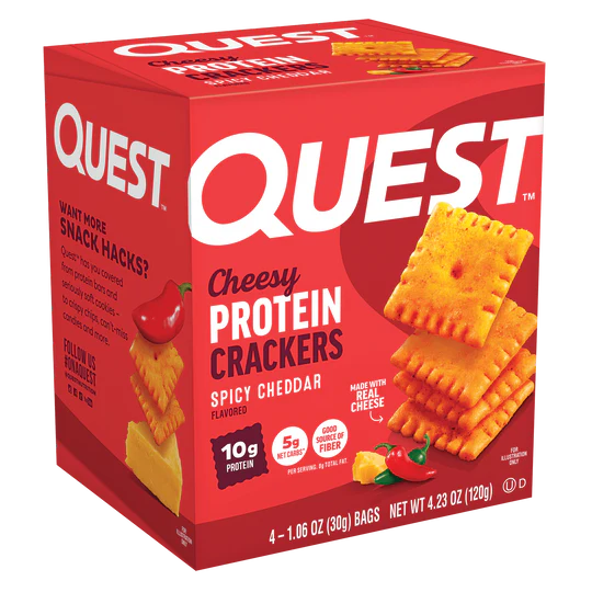 BIG TASTE. BIG NUTRITION*. Quest Cheese Crackers provide all the crunch and satisfying taste of a regular cheese cracker, but ours have 10g of protein and 5g of net carbs per serving.