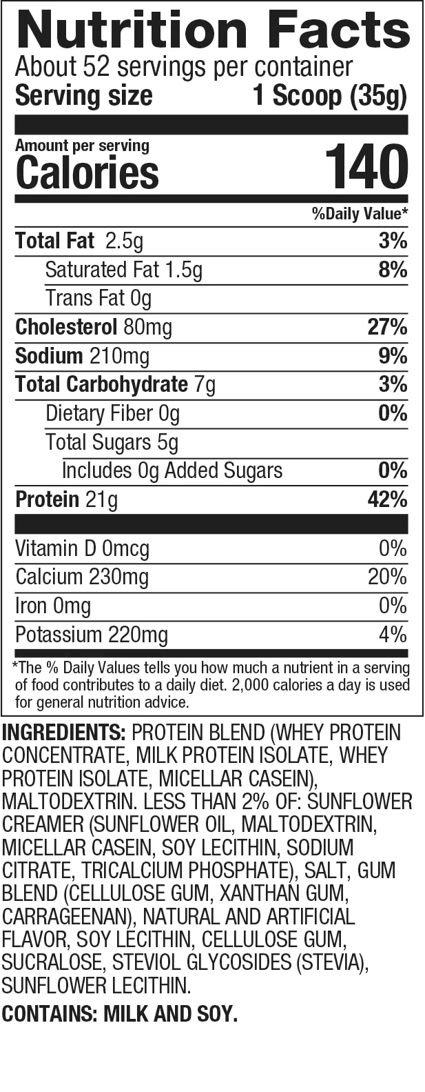 21 grams of multi-sourced protein per serving including whey protein concentrate, milk protein isolate, whey protein isolate and micellar casein. Great for extended periods of time between meals