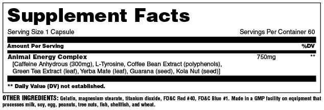 With its convenient 1-capsule dose, Animal Energy is simple to use yet powerful. Animal Energy’s unique 2-Stage delivery system provides both quick and lasting effects. You can get it, but can you keep it – energy, focus and mood that comes quick yet lasts? The single capsule Animal Energy is here. Each capsule is one powerful serving of 300 mg of caffeine and over 450 mg of our Animal Energy Complex.