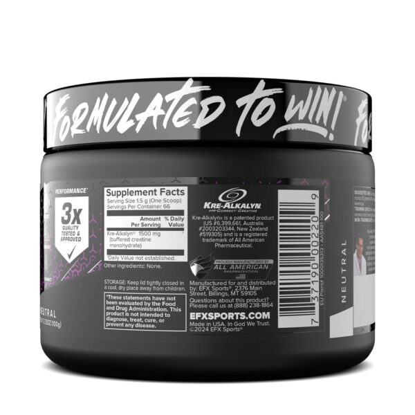 Creatine monohydrate is the single most studied sports supplement ever. It’s the top pre-workout and post-workout compound for athletes and bodybuilders who want to improve muscle mass, increase power, enhance performance, and accelerate muscle recovery. Kre Alkalyn EFX is 99.9% pure creatine monohydrate—science-backed, clinically tested, and safe for professional athletes looking for a legal edge!