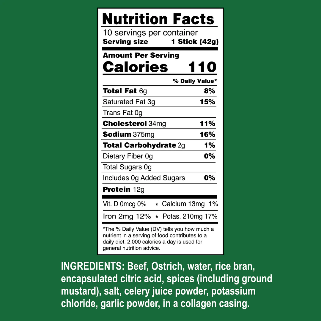 NATURAL OSTRIM GRASS-FED BEEF and OSTRICH. The meat stick that started it all. OSTRIM NATURAL is a premium tender and delicious clean nutritional protein sticks made with all natural ingredients with a pinch of tasty spice cooked slow and low to perfection. So good tasting and So good for you!