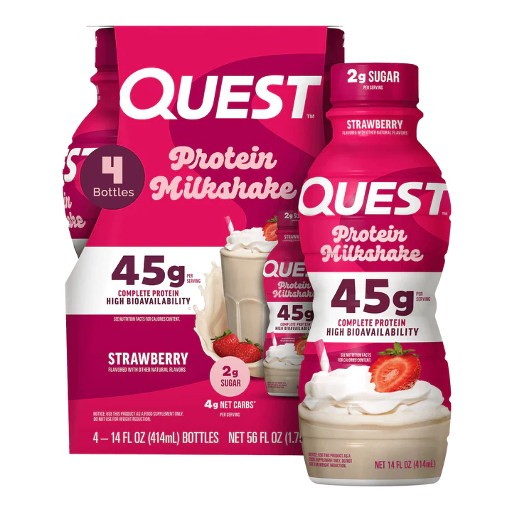 Protein Milkshakes deliver fruity indulgence with the macros you’d expect from Quest. Each serving features a whopping 45g of protein*. And with 2g of sugar and 4g of net carbs* these protein shakes are the ultimate cheat code. Made with ultrafiltered nonfat milk, they’re just right for whenever you need a delicious protein boost.