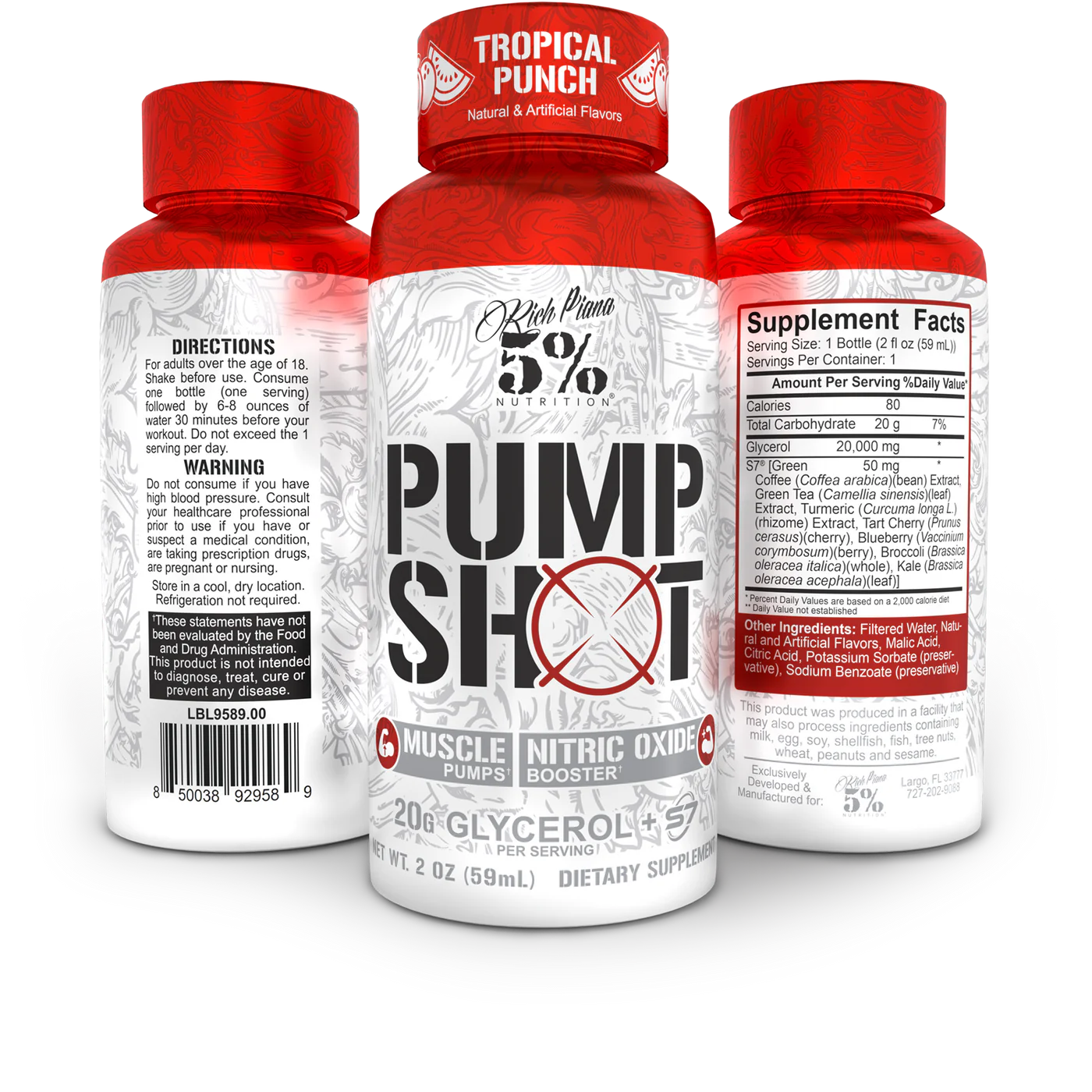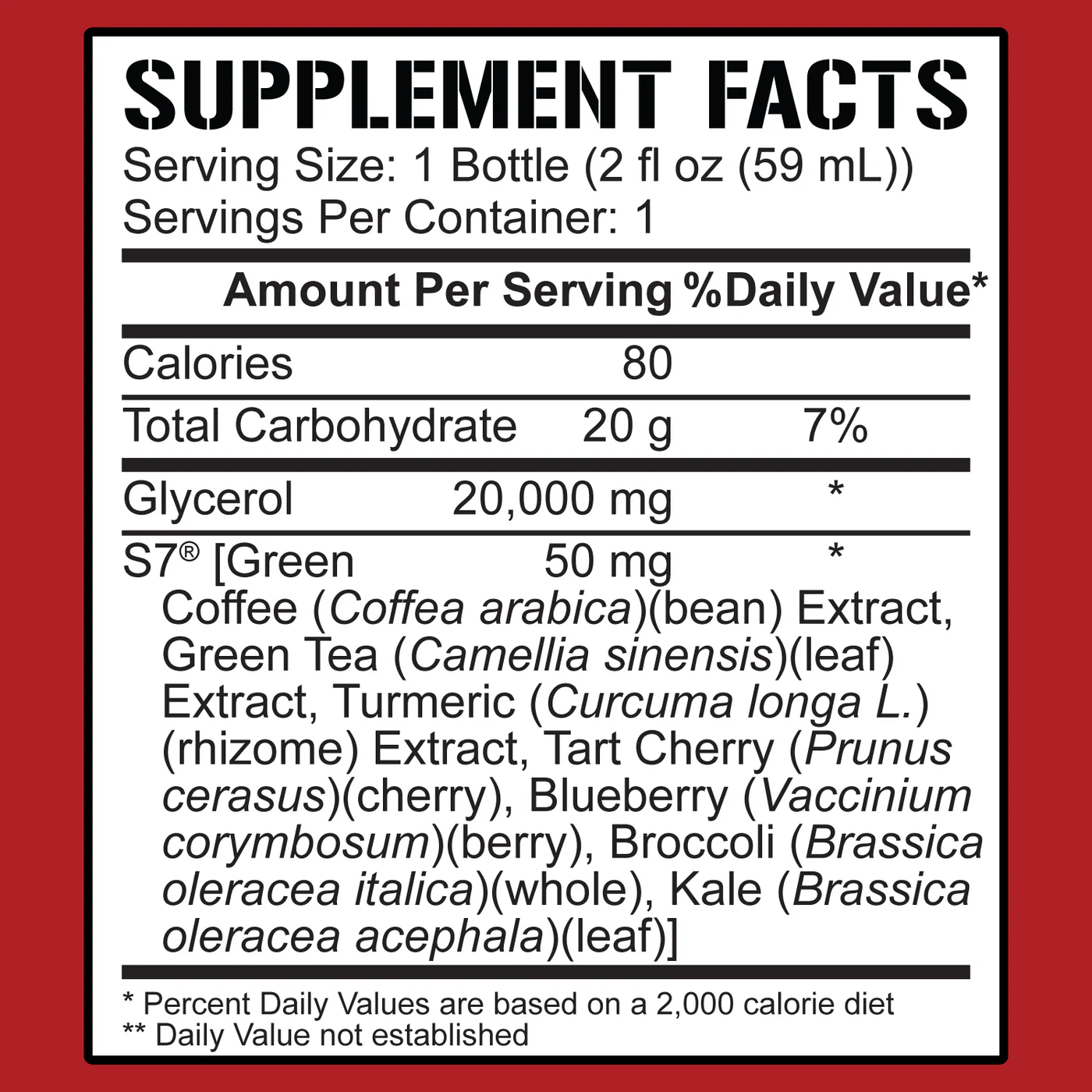 5% Nutrition Pump Shot gives you an insane 20g of glycerol for unbelievable pumps, extreme hydration, extended endurance, and exceptional performance. We’ve also added the powerful N.O. booster S7®. Just a 2oz Shot 30 minutes before your workout, and you can expect a fantastic training session.