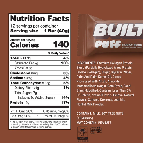 Each bar provides 140 calories, 17g of protein, and only 6g of sugar, making it a smart choice for staying fueled without overindulging. Whether you need a quick protein boost or a sweet snack on the go, Rocky Road Puff delivers flavor and function in one light, fluffy bar.