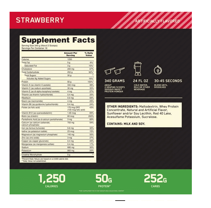 Serious Mass is the ultimate muscle building and weight gain formula. With 1,250 calories per 2-scoop serving and 50 grams of protein to support muscle recovery, this powder makes the ideal post-workout and between meals shake for sizing up your goals. Serious Mass provides you with the tools you need to support your weight gains goals.