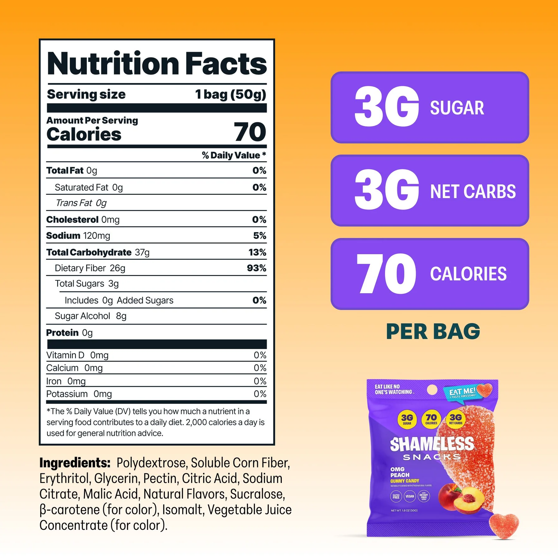 Shameless Snacks | Snacks That Taste Good and Feel Good, Too! Guilt-Free delicious candy with only 3g sugar, 3g net carbs, and 70 calories per bag. Real Natural Fruit Flavors. Vegan, Gluten-Free, and Keto-Friendly Candy. Eat like no one’s watching! Guilt-Free delicious candy with only 3g sugar, 3g net carbs, and 70 calories per bag.