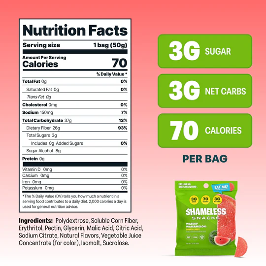 Shameless Snacks | Snacks That Taste Good and Feel Good, Too! Guilt-Free delicious candy with only 3g sugar, 3g net carbs, and 70 calories per bag. Real Natural Fruit Flavors. Vegan, Gluten-Free, and Keto-Friendly Candy. Eat like no one’s watching! Guilt-Free delicious candy with only 3g sugar, 3g net carbs, and 70 calories per bag.