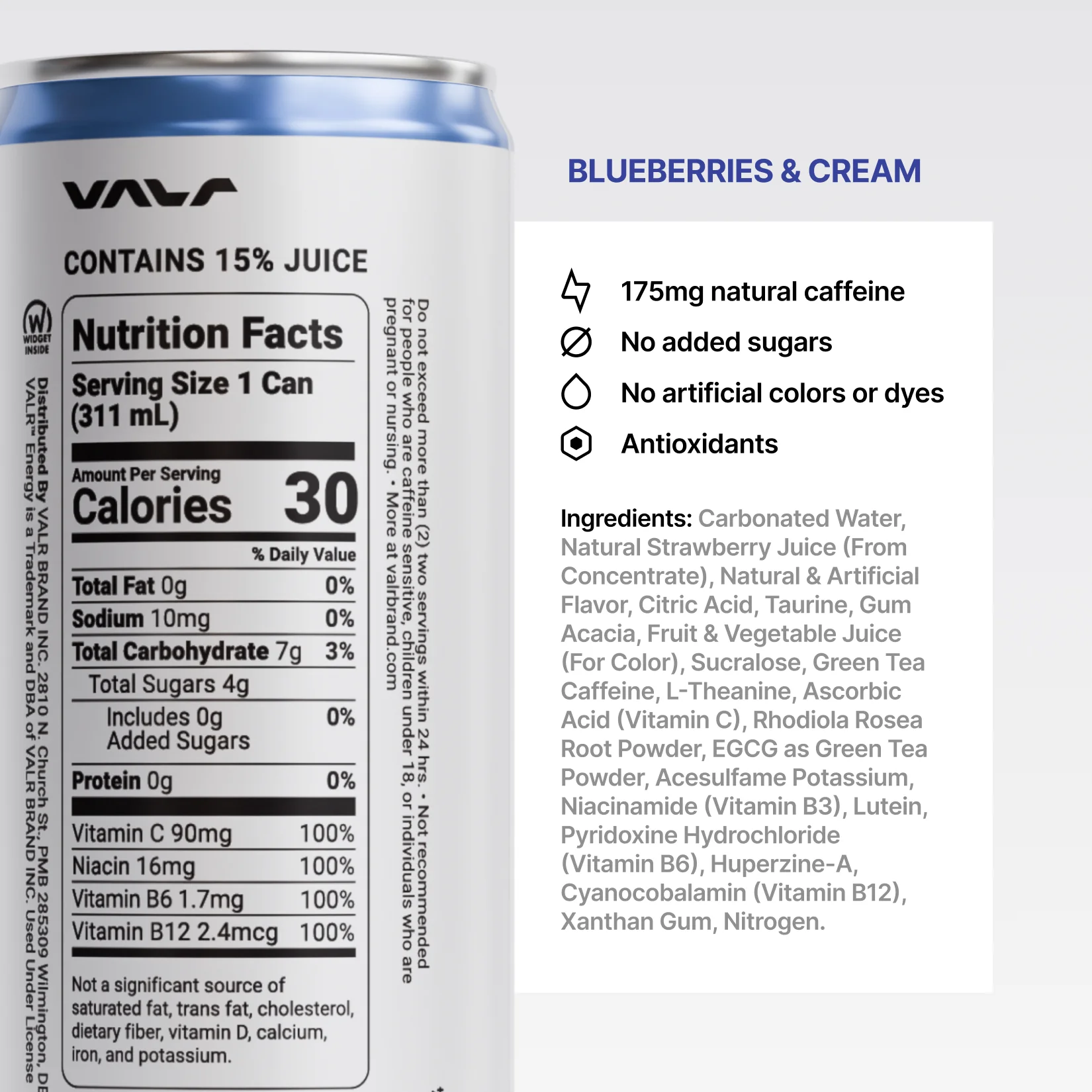 VALR Energy Nitrogen-Infused Blueberries & Cream is a smooth and refreshing energy drink with a sweet blueberry taste and a light creamy finish. It is made to be easy to drink and enjoyable any time you need energy.